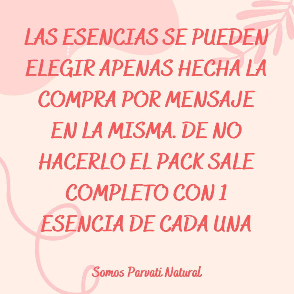 LAS ESENCIAS SE PUEDEN ELEGIR APENAS HECHA LA COMPRA POR MENSAJE EN LA MISMA. DE NO HACERLO EL PACK SALE COMPLETO CON 1 ESENCIAS DE CADA UNA